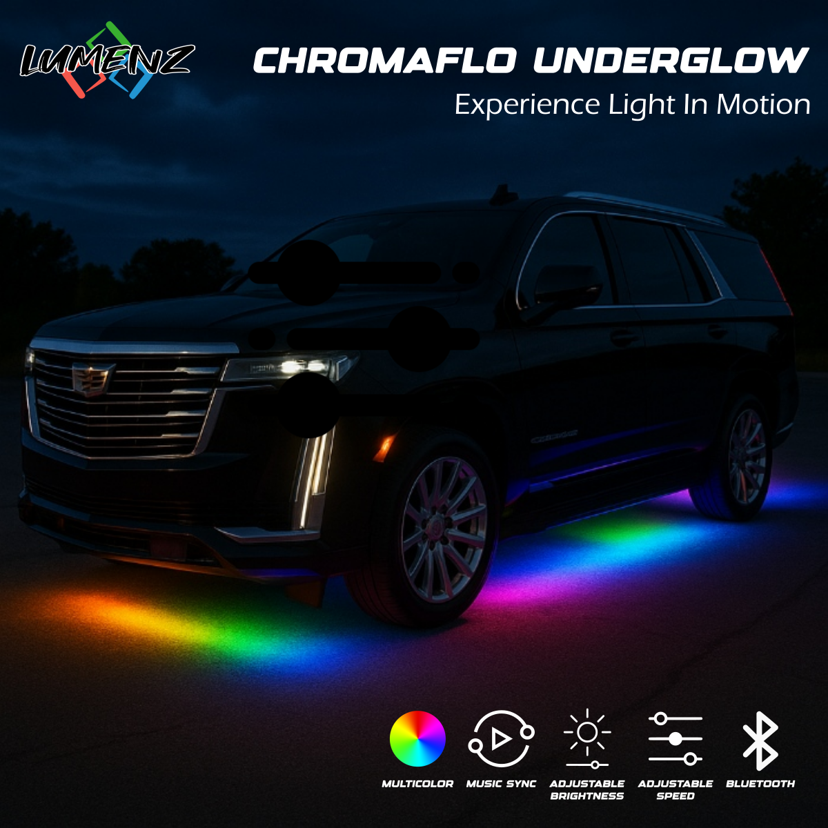 Whether you’re cruising through the city, showcasing your vehicle at an event, or simply enjoying the perfect soundtrack, the ChromaFlo Underglow Kit guarantees your ride will be the undeniable center of attention. Define your vehicle’s presence and express your unique style with this cutting-edge, easy-to-install, and truly dynamic lighting solution – all at your fingertips.